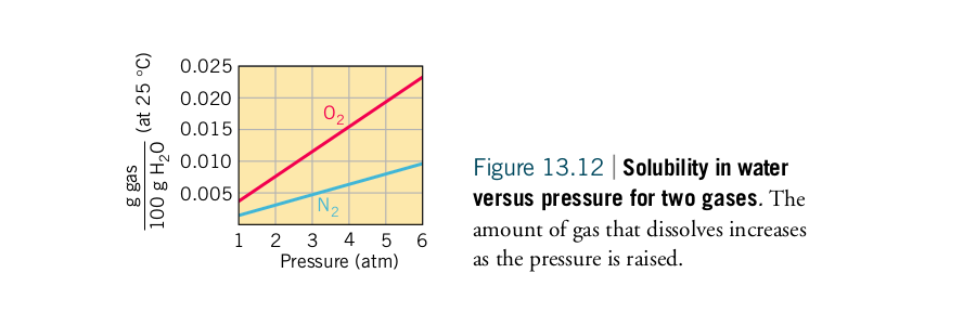 The effect of pressure on the solubility of a gas can also be explained by Le Châtelier’s principle. In this case, the disturbance is an increase in the pressure of the gas above the solution. How could the system counteract the pressure increase? The answer is: by having more gas dissolve in the solution. In this way, the pressure of the gas is reduced and the concentration of the gas in the solution is increased. In other words, increasing the pressure of the gas will cause the gas to become more soluble. Figure 13.12 shows how the solubility in water of oxygen and nitrogen vary with pressure. The straight lines on the graph indicate that the concentration of the gas is directly proportional to its pressure above the solution. This is expressed quantitatively by Henry’s law, which states that the concentration of a gas in a liquid at any given temperature is directly proportional to the partial pressure of the gas over the solution. Cgas = kHPgas (T is constant) (13.4) where Cgas is the concentration of the gas and Pgas is the partial pressure of the gas above the solution. The proportionality constant, kH, called the Henry’s law constant, is unique to each gas. The equation is an approximation that works best at low concentrations and pressures and for gases that do not react with the solvent.